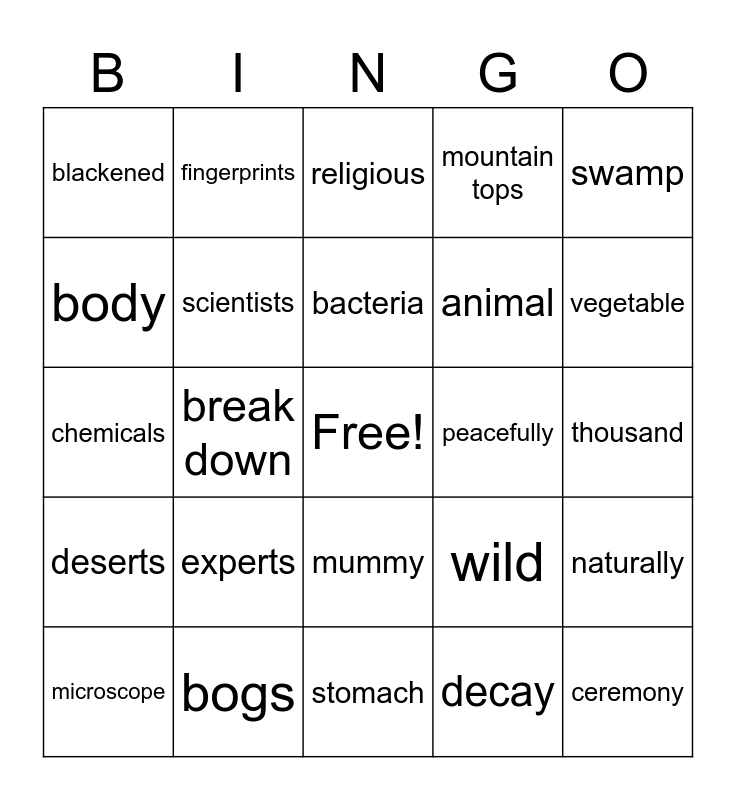 This bingo card has a free space and 26 words: mummy, decay, bacteria, bogs, swamp, blackened, body, fingerprints, thousand, wild, animal, chemicals, naturally, microscope, break down, rot, mountain tops, deserts, religious, ceremony, vegetable, stomach, peacefully, experts, scientists and ancient.