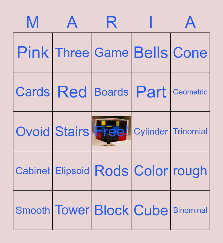 This bingo card has a free space and 30 words: Tower, Stamp, Stairs, Broad, Pink, Game, Red, Rods, Cylinder, Block, Trinomial, Binominal, Cube, Cube, Geometric, Tablet, Color, Cabinet, Elipsoid, Cone, Ovoid, Sound, Three, Part, Cards, Bells, rough, Smooth, Boards and Bottles.