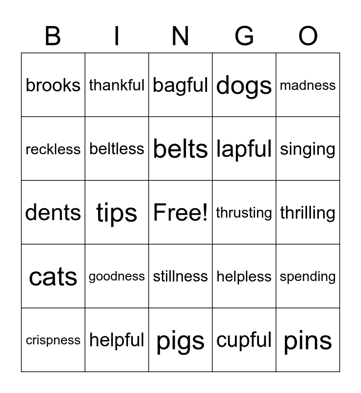 This bingo card has a free space and 24 words: goodness, helpful, belts, crispness, madness, brooks, reckless, thankful, thrusting, stillness, lapful, dents, helpless, spending, beltless, cupful, thrilling, bagful, singing, tips, pins, cats, dogs and pigs.