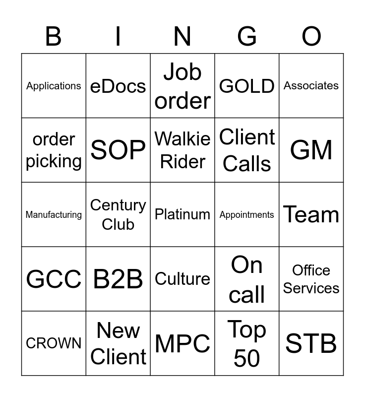 This bingo card has 39 words: Free!, Work Comp, Fill Fill Fill, SOP, CROWN, Culture, Walkie Rider, Clients, Associates, GCC, Century Club, GOLD, Platinum, Team, Appointments, B2B, Zoom, Applications, I-9, On call, order picking, MPC, Client Calls, GM, Hours, Payroll, STB, Mia, value-add, eDocs, Mickey, PeopleNet, Job order, New Client, Top 50, NCJO, Office Services, Manufacturing and Circle.