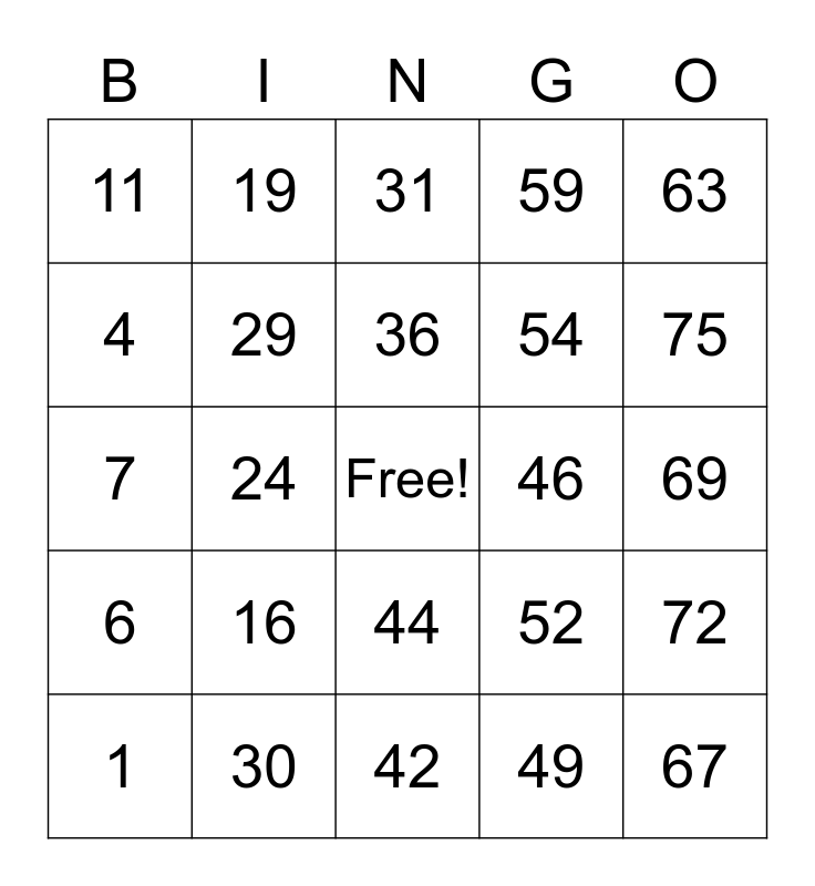 This bingo card has a free space and 24 words: 1, 16, 36, 49, 63, 11, 19, 31, 46, 69, 7, 29, 52, 72, 4, 30, 42, 59, 75, 6, 24, 44, 54 and 67.