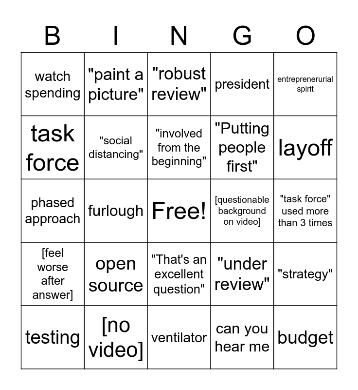 This bingo card has a free space and 25 words: open source, ventilator, "involved from the beginning", testing, entreprenerurial spirit, watch spending, task force, "paint a picture", [questionable background on video], "That's an excellent question", "Putting people first", phased approach, "under review", "strategy", "social distancing", "PPE", "task force" used more than 3 times, "robust review", layoff, furlough, budget, [no video], [feel worse after answer], president and can you hear me.