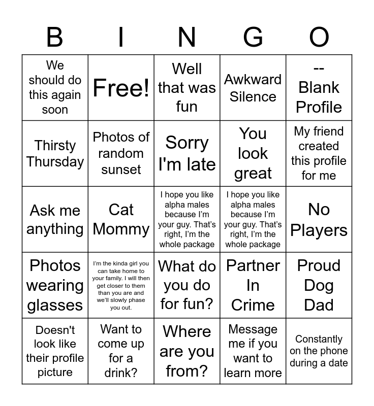 This bingo card has a free space and 34 words: First thing people notice is _______, Message me if you want to learn more, Netflix & Chill, Starting an online conversation w/ "Hey", Photos wearing glasses, Photos of random sunset, -- Blank Profile, Doesn't look like their profile picture, Free!, Married with a baby on the way. Prefer the term “collector” to “hoarder.” Bonus points if you can look after my gerbil collection., Sorry I'm late, Well that was fun, Occupation: In between jobs, Eye roll, I hope you like alpha males because I’m your guy. That’s right, I’m the whole package, My friend created this profile for me, Want to come up for a drink?, Ask me anything, I’m the kinda girl you can take home to your family. I will then get closer to them than you are and we’ll slowly phase you out., Partner In Crime, What do you do for fun?, My self-summary I’m a fun loving guy and a self-starter who has absolutely no interest in committing murder., We should do this again soon, No Players, Where are you from?, Constantly on the phone during a date, Awkward Silence, We can be friends and see how it goes, You look great, Thirsty Thursday, I want a guy to say "Bless You" when I sneeze, Cat Mommy, Proud Dog Dad and Sunday Brunch.