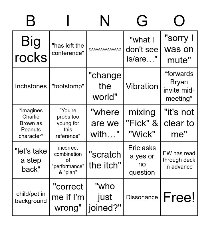This bingo card has 33 words: Free!, Andy introduces himself, "You're probs too young for this reference", "I am still struggling with", "let's take a step back", "footstomp", "sorry I was on mute", child/pet in background, "has left the conference", *French*, "change the world", CAAAAAAAAAAAAD, running commentary on Slack, agenda not on track, mixing "Fick" & "Wick", *forwards Bryan invite mid-meeting*, "correct me if I'm wrong", *imagines Charlie Brown as Peanuts character*, incorrect combination of "performance" & "plan", Eric asks a yes or no question, "scratch the itch", "oh by the way", Big rocks, "it's not clear to me", "who just joined?", "where are we with…", "what I don't see is/are…", Vibration, Inchstones, EW has read through deck in advance, Elegant solution, Dissonance and Too many lists.