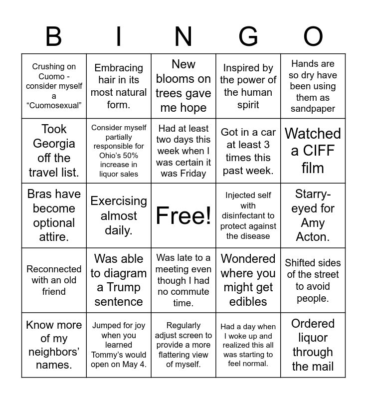 This bingo card has a free space and 36 words: Had consecutive days where you walked fewer than 500 steps, Showered three days in a row, Allowing facial hair to grow untamed, Consider myself partially responsible for Ohio’s 50% increase in liquor sales, Wondered where you might get edibles, Reconnected with an old friend, Had at least two days this week when I was certain it was Friday, Want to touch my face all the time, Hands are so dry have been using them as sandpaper, Walked backwards in a store to avoid someone who didn’t seem to understand distancing, Exercising almost daily., Inspired by the power of the human spirit, Enjoyed a good belly laugh, Injected self with disinfectant to protect against the disease, Watched a CIFF film, Crushing on Cuomo - consider myself a “Cuomosexual”, Calculated how much toilet paper a person should really need for #2, Was able to diagram a Trump sentence, Ordered liquor through the mail, New blooms on trees gave me hope, Starry-eyed for Amy Acton., Shifted sides of the street to avoid people., Jumped for joy when you learned Tommy’s would open on May 4., Know more of my neighbors’ names., Regularly adjust screen to provide a more flattering view of myself., Embracing hair in its most natural form., Bras have become optional attire., Took advantage of 60+ shopping hours, Got in a car at least 3 times this past week., Took Georgia off the travel list., Started a home-decorating project., Ate the same thing for dinner 3 nights in a row., Had a day when I woke up and realized this all was starting to feel normal., Was late to a meeting even though I had no commute time., Excitedly greeting people I’ve never met before. and Afraid to even make eye contact in stores..