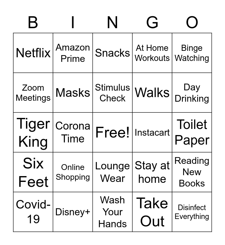 This bingo card has a free space and 29 words: Covid-19, Quarantine Bae, Corona Time, Tik Tok, Netflix, Snacks, Masks, Online Shopping, Instacart, Disney+, Toilet Paper, Disinfect Everything, Wash Your Hands, Take Out, Day Drinking, #NoMakeup, Lounge Wear, Six Feet, Binge Watching, Tiger King, Stay at home, Baking, Walks, Zoom Meetings, At Home Workouts, Amazon Prime, Reading New Books, Stimulus Check and Learn Something New.