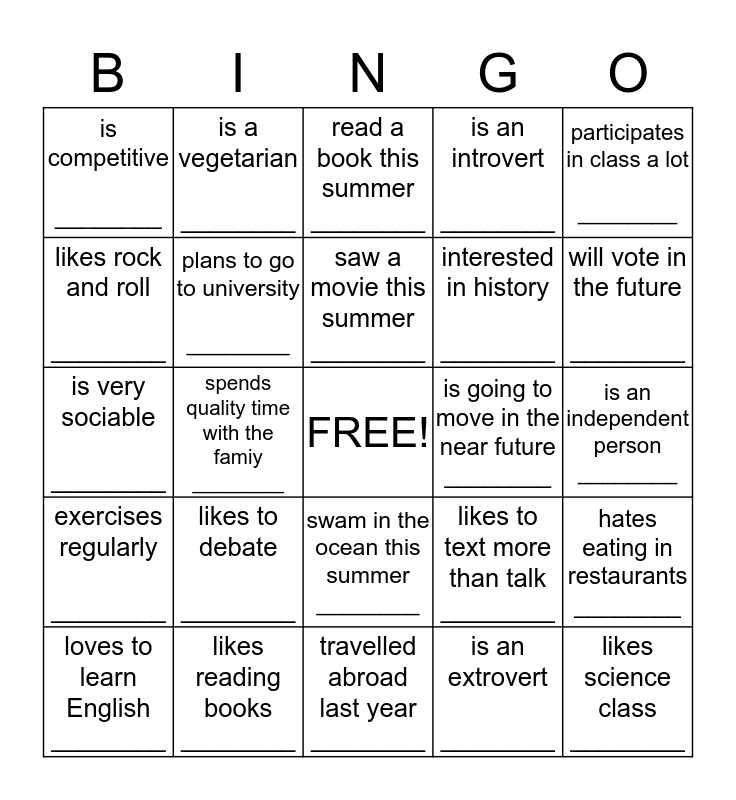 This bingo card has a free space and 24 words: likes to debate ________, likes reading books ________, saw a movie this summer ________, loves to learn English ________, participates in class a lot ________, is competitive ________, likes rock and roll ________, is a vegetarian ________, is going to move in the near future ________, swam in the ocean this summer ________, interested in history ________, is very sociable ________, likes to text more than talk ________, hates eating in restaurants ________, plans to go to university ________, is an extrovert ________, is an independent person ________, read a book this summer ________, will vote in the future ________, spends quality time with the famiy ________, likes science class ________, exercises regularly ________, is an introvert ________ and travelled abroad last year ________.