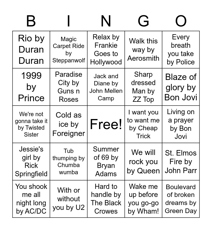 This bingo card has a free space and 24 words: You shook me all night long by AC/DC, Tub thumping by Chumba wumba, Jack and Diane by John Mellen Camp, Wake me up before you go-go by Wham!, Every breath you take by Police, Rio by Duran Duran, Magic Carpet Ride by Steppanwolf, Relax by Frankie Goes to Hollywood, I want you to want me by Cheap Trick, Living on a prayer by Bon Jovi, We're not gonna take it by Twisted Sister, Paradise City by Guns n Roses, We will rock you by Queen, St. Elmos Fire by John Parr, 1999 by Prince, With or without you by U2, Hard to handle by The Black Crowes, Walk this way by Aerosmith, Blaze of glory by Bon Jovi, Jessie's girl by Rick Springfield, Cold as ice by Foreigner, Summer of 69 by Bryan Adams, Sharp dressed Man by ZZ Top and Boulevard of broken dreams by Green Day.