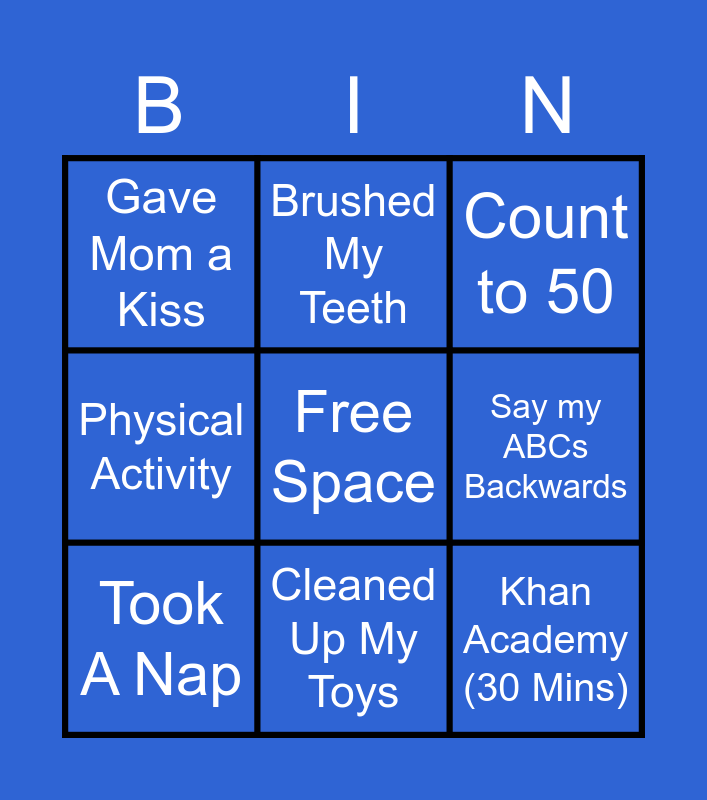 This bingo card has a free space and 8 words: Say my ABCs Backwards, Count to 50, Brushed My Teeth, Took A Nap, Gave Mom a Kiss, Khan Academy (30 Mins), Physical Activity and Cleaned Up My Toys.