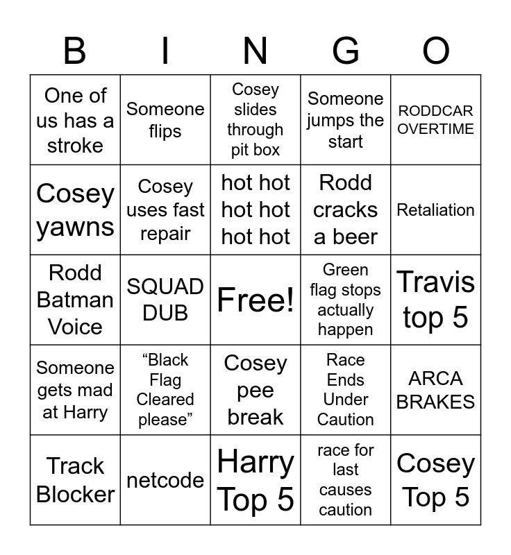 This bingo card has a free space and 24 words: “Black Flag Cleared please”, netcode, hot hot hot hot hot hot, Track Blocker, RODDCAR OVERTIME, One of us has a stroke, Cosey yawns, Someone flips, Green flag stops actually happen, Cosey pee break, Rodd cracks a beer, Rodd Batman Voice, Race Ends Under Caution, ARCA BRAKES, Cosey uses fast repair, race for last causes caution, Travis top 5, Cosey slides through pit box, Retaliation, SQUAD DUB, Cosey Top 5, Someone gets mad at Harry, Someone jumps the start and Harry Top 5.