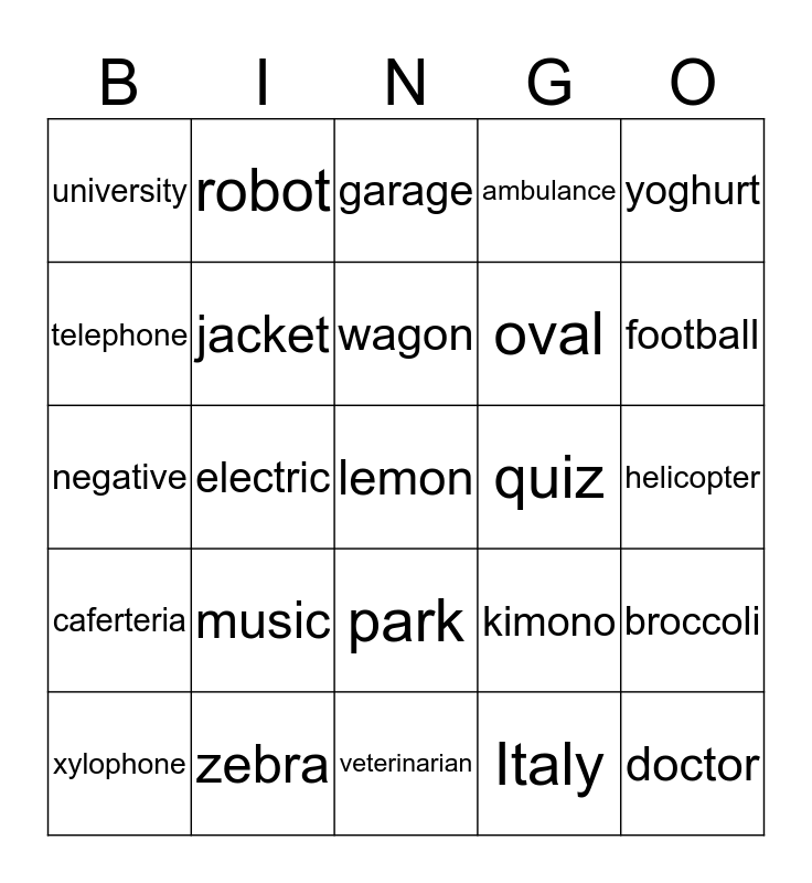 This bingo card has a free space and 24 words: music, zebra, wagon, xylophone, yoghurt, university, telephone, robot, quiz, park, oval, negative, kimono, broccoli, jacket, Italy, helicopter, garage, football, electric, doctor, caferteria, ambulance and veterinarian.