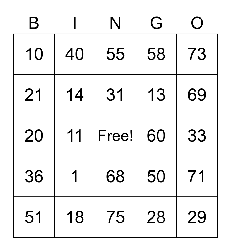 This bingo card has a free space and 24 words: 1, 18, 31, 51, 73, 10, 21, 40, 60, 68, 13, 20, 50, 71, 14, 28, 33, 55, 69, 11, 29, 36, 58 and 75.
