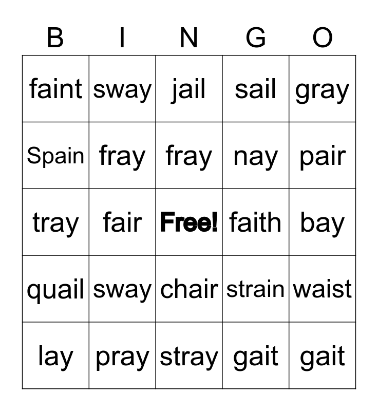 This bingo card has a free space and 29 words: lay, paid, fair, play, faint, jail, fray, sway, faith, pray, bay, gait, stray, gait, pair, jay, chair, quail, gray, tray, strain, slay, nay, Spain, sail, sway, waist, fray and sprain.