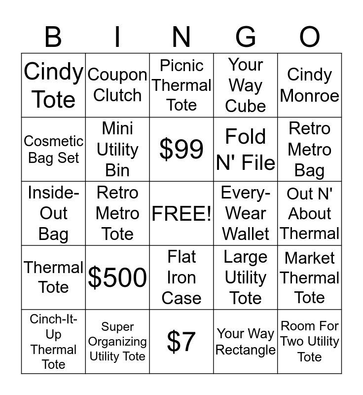 This bingo card has a free space and 25 words: $500, $7, $99, Cinch-It-Up Thermal Tote, Cindy Monroe, Cindy Tote, Cosmetic Bag Set, Coupon Clutch, Every-Wear Wallet, Flat Iron Case, Fold N' File, Inside-Out Bag, Large Utility Tote, Market Thermal Tote, Mini Utility Bin, Organizing Utility Tote, Out N' About Thermal, Picnic Thermal Tote, Retro Metro Bag, Retro Metro Tote, Room For Two Utility Tote, Super Organizing Utility Tote, Thermal Tote, Your Way Cube and Your Way Rectangle.