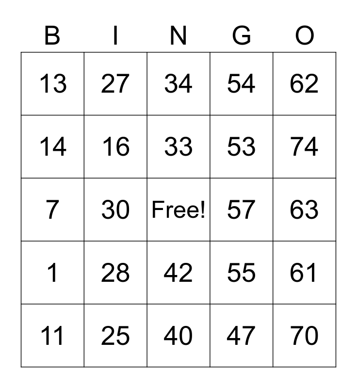 This bingo card has a free space and 24 words: 11, 28, 33, 47, 62, 13, 27, 34, 57, 63, 7, 16, 55, 61, 14, 25, 40, 54, 74, 1, 30, 42, 53 and 70.