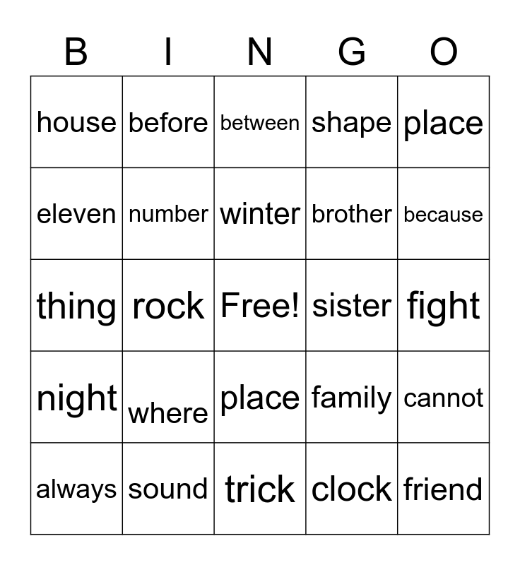 This bingo card has a free space and 24 words: where, sound, winter, always, place, house, eleven, before, sister, place, brother, thing, family, cannot, number, clock, fight, between, because, rock, friend, night, shape and trick.