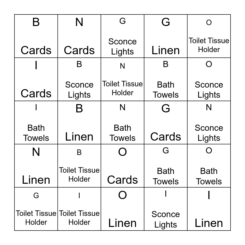 This bingo card has a free space and 24 words: B Toilet Tissue Holder, I Toilet Tissue Holder, N Toilet Tissue Holder, G Toilet Tissue Holder, O Toilet Tissue Holder, B Cards, I Cards, N Cards, G Cards, O Cards, B Bath Towels, I Bath Towels, G Bath Towels, O Bath Towels, B Sconce Lights, I Sconce Lights, N Sconce Lights, G Sconce Lights, O Sconce Lights, B Linen, I Linen, N Linen, G Linen and O Linen.