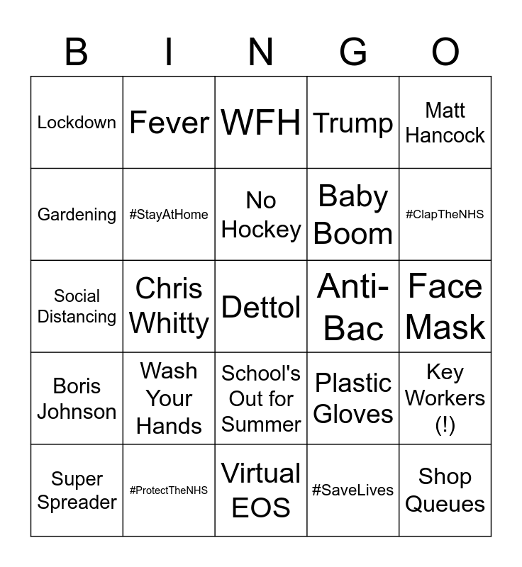 This bingo card has 40 words: Covid 19, Social Distancing, Cancelled Events, #StayAtHome, #ProtectTheNHS, School's Out for Summer, No Hockey, Coronavirus, Matt Hancock, Boris Johnson, Chris Whitty, Trump, Dettol, Face Mask, Anti-Bac, Wash Your Hands, 2M, Lockdown, Zoom, WFH, Key Workers (!), #SaveLives, Baby Boom, Gardening, Paint-By-Numbers, Jigsaws, Tik-Tok, Online Food Shop, Shop Queues, Stockpiling, Quarentine, Super Spreader, Isolation, Plastic Gloves, #ClapTheNHS, Virtual EOS, Kahoot, Cough, Fever and Sneeze.