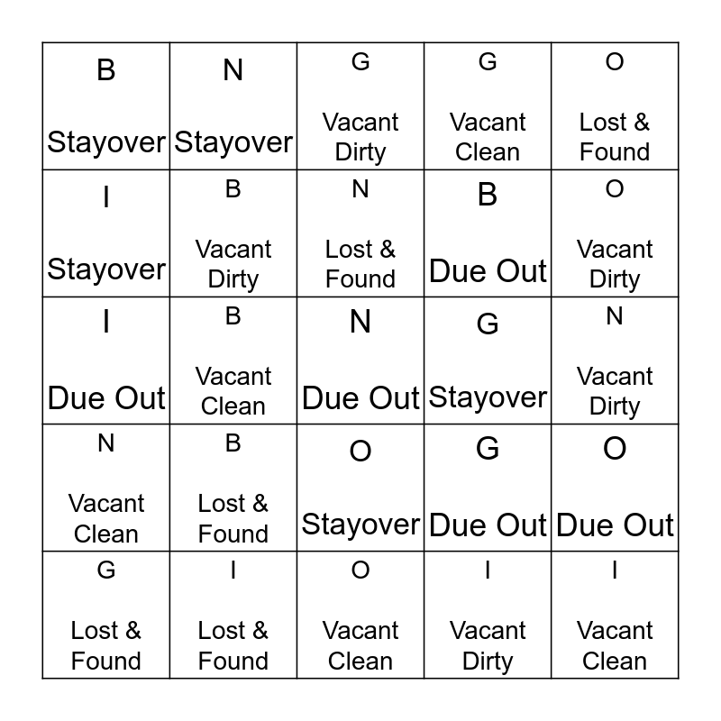 This bingo card has a free space and 24 words: B Lost & Found, I Lost & Found, N Lost & Found, G Lost & Found, O Lost & Found, B Stayover, I Stayover, N Stayover, G Stayover, O Stayover, B Due Out, I Due Out, G Due Out, O Due Out, B Vacant Dirty, I Vacant Dirty, N Vacant Dirty, G Vacant Dirty, O Vacant Dirty, B Vacant Clean, I Vacant Clean, N Vacant Clean, G Vacant Clean and O Vacant Clean.