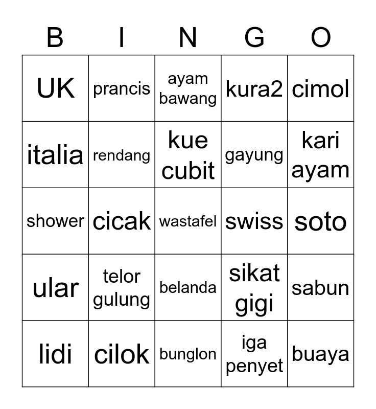 This bingo card has a free space and 24 words: telor gulung, cilok, kue cubit, lidi, cimol, UK, italia, prancis, swiss, belanda, gayung, shower, sikat gigi, sabun, rendang, iga penyet, soto, ayam bawang, kari ayam, cicak, buaya, ular, kura2 and bunglon.