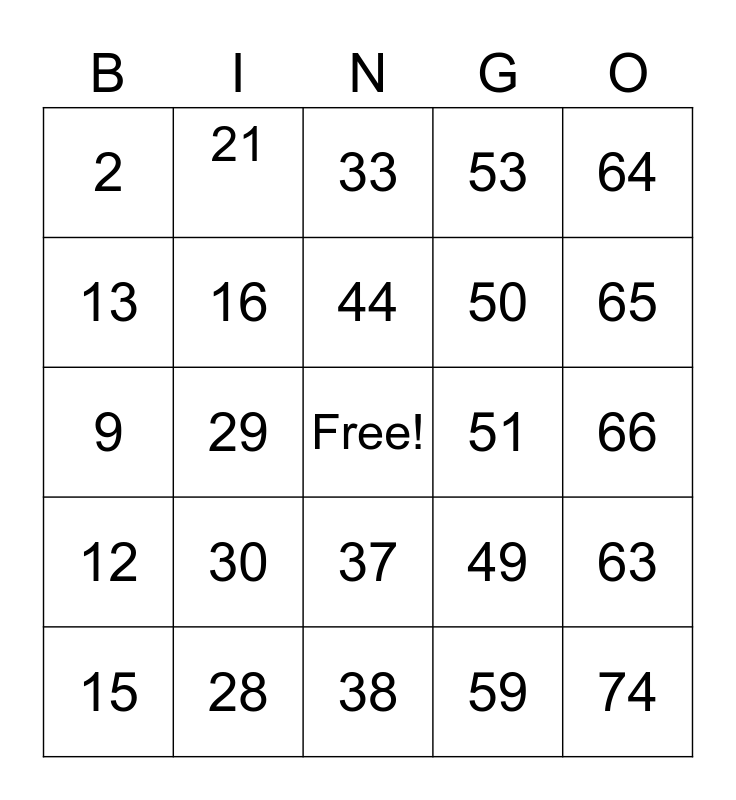 This bingo card has a free space and 75 words: 10, 19, 33, 55, 70, 14, 20, 42, 59, 62, 6, 26, 51, 65, 5, 16, 36, 49, 75, 13, 23, 44, 50, 64, 2, 17, 31, 46, 61, 7, 18, 32, 47, 63, 9, 21, 34, 48, 66, 15, 22, 35, 52, 67, 11, 24, 37, 53, 68, 1, 25, 38, 54, 69, 4, 27, 39, 56, 71, 8, 28, 40, 57, 72, 3, 29, 41, 58, 73, 12, 30, 43, 60, 74 and 45.