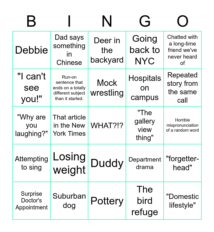 This bingo card has a free space and 77 words: "Dashiell is a sweetie pie", Cliff, the neighbor, Deer in the backyard, Clearly not screensharing experts, Age jokes, Bad pun, Cab Calloway, African Dance Class, Starting a garden, Accidentally ends the call, "Bob, you tell", Interrupting their own question, Mock wrestling, "I can't see you!", Haircuts, That article in the New York Times, Mentions a random internet meme or video, "Domestic lifestyle", The most beautiful bike ride, Chatted with a long-time friend we've never heard of, Unaware faces aren't on camera, "Why are you laughing?", Run-on sentence that ends on a totally different subject than it started., Dad says something in Chinese, Going back to NYC, Red Sneakers, The fellowship, Repeat story from the last call, Knee status update, On sabbatical, Cuomo, Inappropriate joke or comment, Working on a book, Department drama, Repeated story from the same call, Hospitals on campus, Madeline's parents coffee, A "Benedict Cumberbund" moment, Horrible mispronunciation of a random word, The bird refuge, being jewish, Show a photo, sculpture, or painting, "Hold everything", Playing their own version of Bingo, Fake accent, "Enough about us", Surprise Doctor's Appointment, Debbie, Fray, Rick, Julia, Duddy, Going to the beach, Chick Webb, Lydia, Rebecca, How is work?, Back when I was younger..., Bickering about the laptop placement, Yelling for Dashiell, Losing weight, Bread!, So many layers, "Goodie", Short jokes, Turtles, Biden's VP Pick, "The gallery view thing", "A really stupid question", Lots of tools in the basement, Stony Brook House Issues, "forgetter-head", Attempting to sing, Suburban dog, Pardon the expression, Pottery and Christmas.
