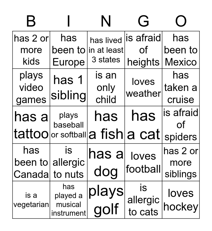 This bingo card has 25 words: is allergic to nuts, plays golf, is an only child, is a vegetarian, has been to Mexico, has 2 or more kids, plays video games, has been to Europe, has a cat, has a dog, loves weather, has a tattoo, loves football, has 2 or more siblings, has 1 sibling, loves hockey, is afraid of spiders, has lived in at least 3 states, has taken a cruise, plays baseball or softball, has a fish, has played a musical instrument, has been to Canada, is afraid of heights and is allergic to cats.