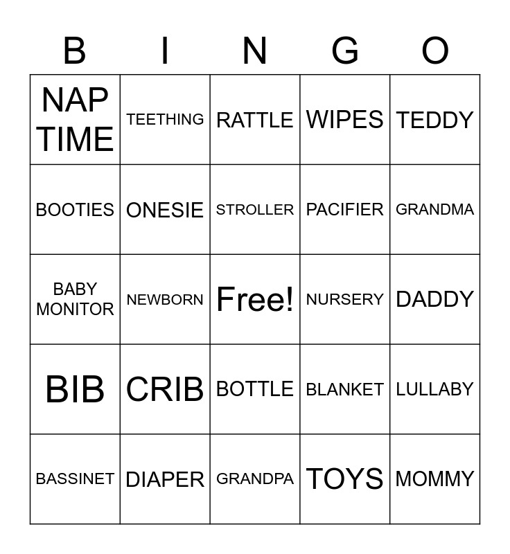This bingo card has a free space and 40 words: BABY BOY, BABY MONITOR, CAR SEAT, ONESIE, DIAPER, BOTTLE, STROLLER, PLAY PEN, TEDDY, BIB, NEWBORN, WIPES, MOMMY, DADDY, NURSERY, CRIB, HIGH CHAIR, NAP TIME, BATH TIME, RATTLE, LULLABY, TOYS, PACIFIER, BOOTIES, MITTENS, STORK, TRUCKS, CRAVINGS, SON, TEETHING, COLIC, BASSINET, MOBILE, BLANKET, GRANDMA, GRANDPA, GRANDSON, PAMPERS, TEETHING and BABY FOOD.