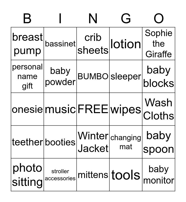 This bingo card has a free space and 24 words: booties, stroller accessories, BUMBO, photo sitting, Sophie the Giraffe, breast pump, personal name gift, bassinet, wipes, Winter Jacket, sleeper, onesie, changing mat, baby spoon, baby powder, tools, Wash Cloths, crib sheets, baby blocks, music, baby monitor, teether, lotion and mittens.