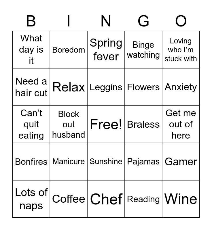 This bingo card has a free space and 24 words: Manicure, Coffee, Leggins, Lots of naps, Loving who I’m stuck with, What day is it, Need a hair cut, Boredom, Braless, Sunshine, Flowers, Can’t quit eating, Pajamas, Gamer, Relax, Reading, Get me out of here, Spring fever, Anxiety, Block out husband, Wine, Bonfires, Binge watching and Chef.