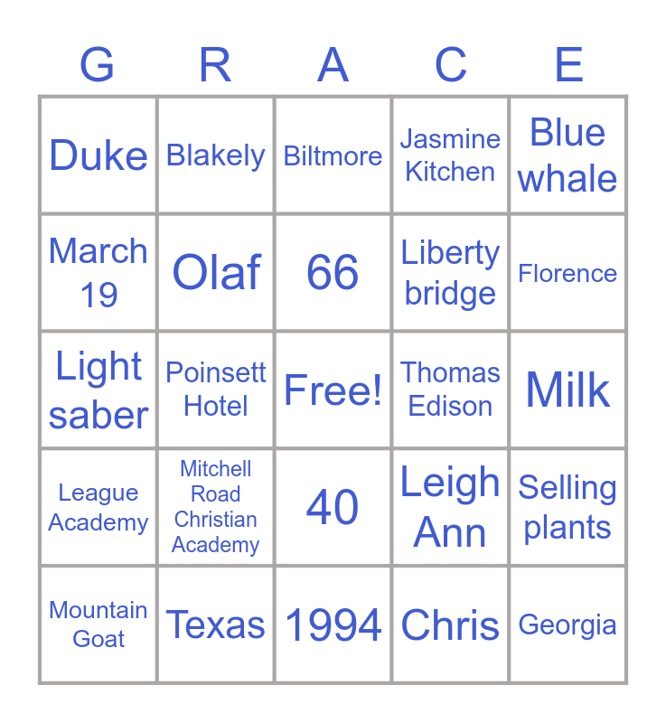 This bingo card has a free space and 64 words: Tiger, Maddie, Piano, Selling plants, Blue Ridge, Security, Blakely, GroupMe, 66, Bethlehem, 40, Mice, Milk, Blue whale, Clock, March 19, Poinsett Hotel, Duke, Clemson, Liberty bridge, Mitchell Road Christian Academy, League Academy, Jasmine Kitchen, Latte, Spill the beans, 1 Samuel, ENT, May 10, Pleasantburg, Philippines, Greenville drive, 3, 4, Nike, Florence, Mountain Goat, Child Life, Chris, Victor, Olaf, Light saber, Thomas Edison, Sidewall, Carol’s, Grace Downtown, Georgia, Texas, Peace Center, Leigh Ann, Chelsea, Savannah, 1939, 1994, Top Gun, Finding Nemo, 9, Biltmore, Sassafrass mountain, 2004, Reedy River, Swamp Rabbit Trail, Jordan, Elsa and Joey.