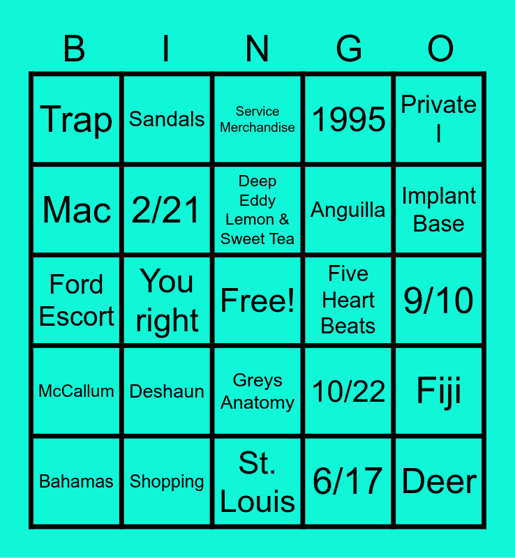 This bingo card has a free space and 24 words: Deshaun, Shopping, Deep Eddy Lemon & Sweet Tea, Bahamas, Private I, Trap, Mac, Sandals, Five Heart Beats, Greys Anatomy, Anguilla, Ford Escort, 10/22, Fiji, 2/21, 6/17, 9/10, Service Merchandise, Implant Base, You right, Deer, McCallum, 1995 and St. Louis.