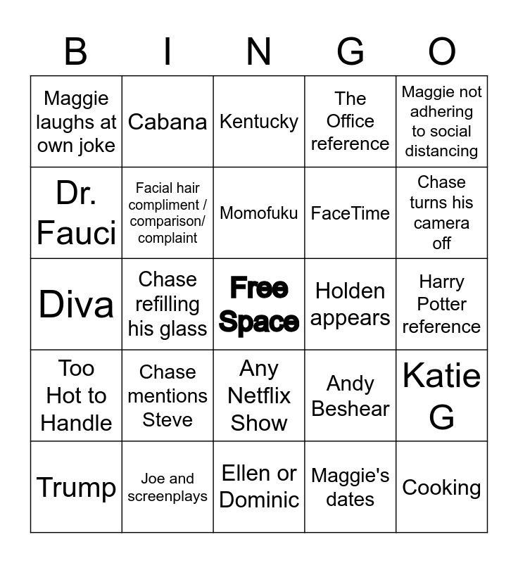This bingo card has a free space and 24 words: Chase mentions Steve, Joe and screenplays, Momofuku, Trump, Maggie not adhering to social distancing, Maggie laughs at own joke, Dr. Fauci, Cabana, Holden appears, Any Netflix Show, FaceTime, Diva, Andy Beshear, Katie G, Facial hair compliment / comparison/ complaint, Maggie's dates, Harry Potter reference, Kentucky, Chase turns his camera off, Chase refilling his glass, Cooking, Too Hot to Handle, The Office reference and Ellen or Dominic.