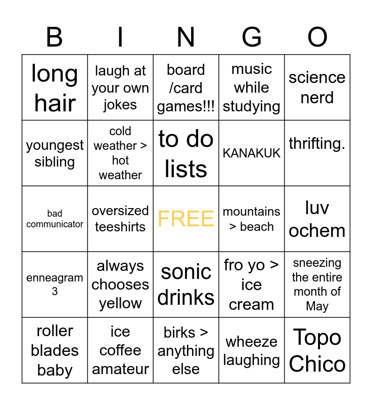 This bingo card has a free space and 24 words: always chooses yellow, ice coffee amateur, to do lists, roller blades baby, science nerd, long hair, youngest sibling, laugh at your own jokes, mountains > beach, sonic drinks, KANAKUK, bad communicator, fro yo > ice cream, sneezing the entire month of May, cold weather > hot weather, wheeze laughing, luv ochem, board /card games!!!, thrifting., oversized teeshirts, Topo Chico, enneagram 3, music while studying and birks > anything else.