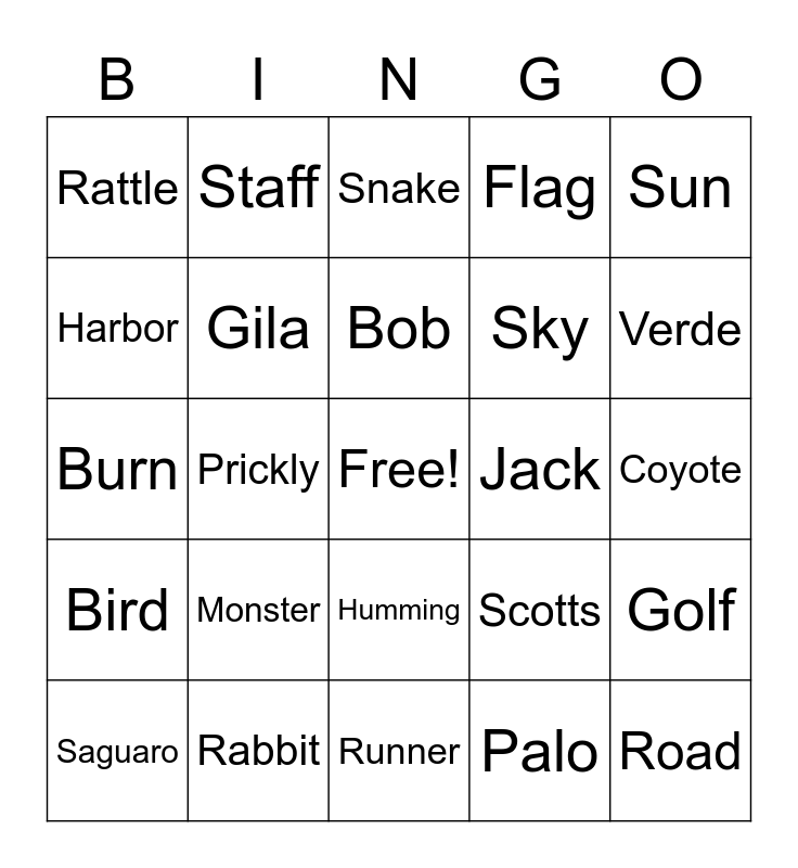 This bingo card has a free space and 29 words: Saguaro, Cholla, Prickly, Pear, Rattle, Snake, Gila, Monster, Jack, Rabbit, Coyote, Road, Runner, Palo, Verde, Yucca, Humming, Bird, Sun, Burn, Scotts, Dale, Sky, Harbor, Flag, Staff, Golf, Bob and Cat.