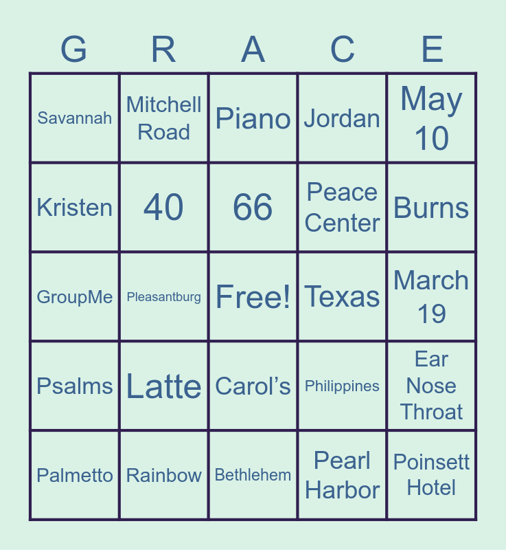 This bingo card has a free space and 80 words: Tiger, Maddie, Piano, Plants, Blue Ridge, Victor, Chris, Leigh Anne, Elsa, Cheryl, Jess, Chelsea, Jordan, Savannah, Rob, Kristen, Vanderbilt, Latte, Blakely, March 19, June 20, May 10, GroupMe, 66, 40, 3, 4, 10, 9, 6, Burns, Carters, Bethlehem, Milk, Palmetto, Texas, Georgia, Blue whale, Clock, Poinsett Hotel, Reedy River, Swamp Rabbit, Greenville Drive, Duke, Clemson, Mitchell Road, League Academy, Jasmine Kitchen, Spill the beans, 1 Samuel, Ear Nose Throat, Pleasantburg, Philippines, Nike, Mountain Goat, Child Life, Light sabers, Grinch, Sidewall, Carol’s, Peace Center, 1939, 1994, 2004, Biltmore, Sassafras mountain, Luke, 12, Garden of Eden, Jesus, Psalms, Rainbow, Gabriel, 5000, Mick Jager, 1975, Pearl Harbor, 34, 1.5 and Kindness.