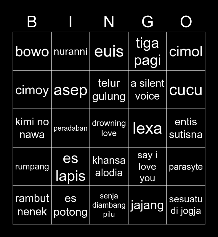 This bingo card has a free space and 24 words: es lapis, es potong, telur gulung, rambut nenek, cimol, bowo, cimoy, nuranni, lexa, khansa alodia, a silent voice, kimi no nawa, say i love you, parasyte, asep, jajang, entis sutisna, euis, cucu, peradaban, sesuatu di jogja, rumpang, tiga pagi and senja diambang pilu.