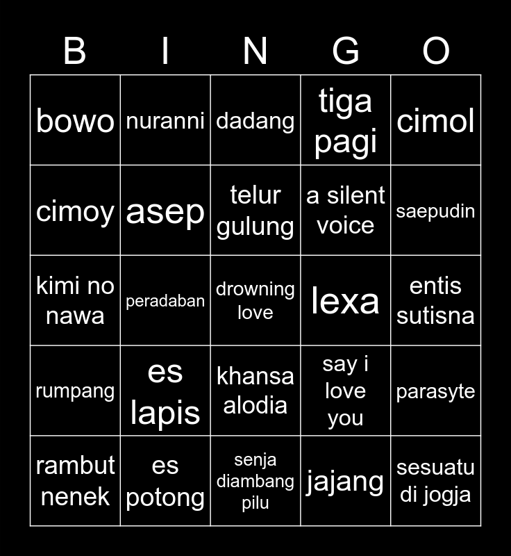 This bingo card has a free space and 24 words: es lapis, es potong, telur gulung, rambut nenek, cimol, bowo, cimoy, nuranni, lexa, khansa alodia, a silent voice, kimi no nawa, say i love you, parasyte, asep, jajang, entis sutisna, dadang, saepudin, peradaban, sesuatu di jogja, rumpang, tiga pagi and senja diambang pilu.