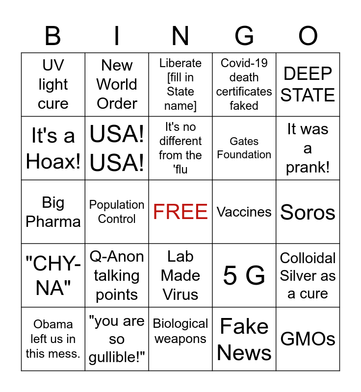 This bingo card has a free space and 24 words: Q-Anon talking points, "you are so gullible!", It's no different from the 'flu, Obama left us in this mess., DEEP STATE, UV light cure, It's a Hoax!, New World Order, Vaccines, Lab Made Virus, Gates Foundation, Big Pharma, 5 G, Colloidal Silver as a cure, USA! USA!, Fake News, Soros, Liberate [fill in State name], It was a prank!, Population Control, GMOs, "CHY-NA", Covid-19 death certificates faked and Biological weapons.