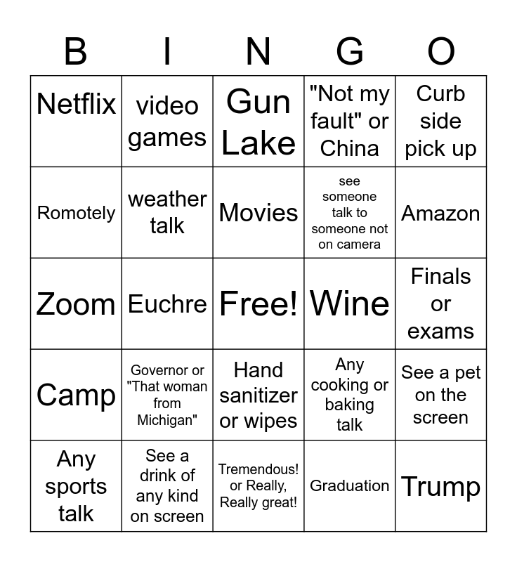 This bingo card has a free space and 24 words: Governor or "That woman from Michigan", See a drink of any kind on screen, Movies, Any sports talk, Curb side pick up, Netflix, Romotely, video games, Wine, Hand sanitizer or wipes, see someone talk to someone not on camera, Zoom, Any cooking or baking talk, See a pet on the screen, weather talk, Graduation, Finals or exams, Gun Lake, Amazon, Euchre, Trump, Camp, "Not my fault" or China and Tremendous! or Really, Really great!.
