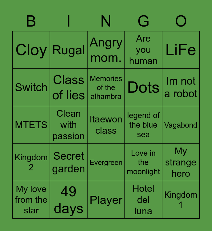 This bingo card has a free space and 24 words: Secret garden, 49 days, Memories of the alhambra, My love from the star, LiFe, Cloy, Switch, Rugal, legend of the blue sea, Evergreen, Dots, MTETS, Love in the moonlight, My strange hero, Class of lies, Hotel del luna, Vagabond, Angry mom., Im not a robot, Clean with passion, Kingdom 1, Kingdom 2, Are you human and Player.