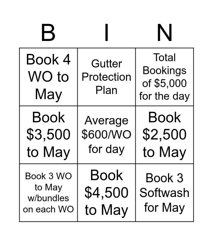 This bingo card has a free space and 8 words: Book $2,500 to May, Total Bookings of $5,000 for the day, Gutter Protection Plan, Book 3 WO to May w/bundles on each WO, Book 4 WO to May, Book 3 Softwash for May, Book $3,500 to May and Book $4,500 to May.