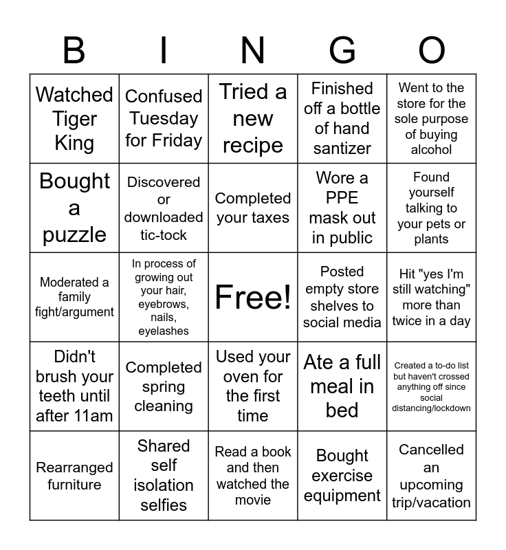 This bingo card has a free space and 24 words: Completed spring cleaning, Shared self isolation selfies, Completed your taxes, Rearranged furniture, Went to the store for the sole purpose of buying alcohol, Watched Tiger King, Bought a puzzle, Confused Tuesday for Friday, Posted empty store shelves to social media, Used your oven for the first time, Wore a PPE mask out in public, Moderated a family fight/argument, Ate a full meal in bed, Created a to-do list but haven't crossed anything off since social distancing/lockdown, Discovered or downloaded tic-tock, Bought exercise equipment, Hit "yes I'm still watching" more than twice in a day, Tried a new recipe, Found yourself talking to your pets or plants, In process of growing out your hair, eyebrows, nails, eyelashes, Cancelled an upcoming trip/vacation, Didn't brush your teeth until after 11am, Finished off a bottle of hand santizer and Read a book and then watched the movie.