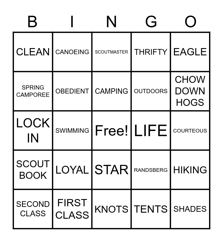 This bingo card has a free space and 54 words: TRUSTWORTHY, LOYAL, HELPFUL, FRIENDLY, COURTEOUS, KIND, OBEDIENT, CHEERFUL, THRIFTY, BRAVE, CLEAN, REVERENT, TENTS, HIKING, TARPS, WATER, CAMPING, OUTDOORS, TENDERFOOT, SECOND CLASS, FIRST CLASS, KNOTS, LIFE, EAGLE, SERVICE, CANOEING, STAR, LEADERS, PLC, COT, MERIT BADGE, FLAG, SPL, QUARTERMASTER, SPRING CAMPOREE, FALL CAMPOREE, SCOUTMASTER, RANDSBERG, SHADES, LOCK IN, POTOWATAMI, KLONDIKE, YUKON, TRAILER, SLEEPING BAG, BUG SPRAY, HYDRATE, WALKING STICK, CHOW DOWN HOGS, SCOUT BOOK, SWIMMING, GAGA BALL, MAFIA and FIRE.