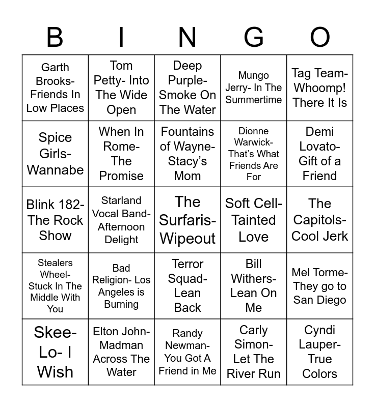 This bingo card has 39 words: Randy Newman- I Love L.A., 2 Pac- California Love, Dead Kennedys- California Uber Alles, When In Rome- The Promise, Skee-Lo- I Wish, Terror Squad- Lean Back, Fountains of Wayne- Stacy’s Mom, SR-71- Right Now, Tag Team- Whoomp! There It Is, Stealers Wheel- Stuck In The Middle With You, Starland Vocal Band- Afternoon Delight, Mungo Jerry- In The Summertime, The Surfaris- Wipeout, The Capitols- Cool Jerk, Soft Cell- Tainted Love, Bad Religion- Los Angeles is Burning, The Dresden Dolls- Shores of California, Garth Brooks- Friends In Low Places, Queen- You’re My Best Friend, Bill Withers- Lean On Me, Spice Girls- Wannabe, Randy Newman- You Got A Friend in Me, Dionne Warwick- That’s What Friends Are For, Demi Lovato- Gift of a Friend, Drake- Started From The Bottom, James Taylor- You’ve Got A Friend, Cyndi Lauper- True Colors, Joe Cocker- With A Little Help From My Friends, LL Cool J- Going Back To Cali, Tom Petty- Into The Wide Open, Simon & Garfunkel- Bridge over Troubled Waters, C.C.R.- Who Will Stop The Rain?, Deep Purple- Smoke On The Water, Elton John- Madman Across The Water, Carly Simon- Let The River Run, Stxy- Come Sail Away, Mel Torme- They go to San Diego, Blink 182- The Rock Show and Scott McKenzie- San Francisco.