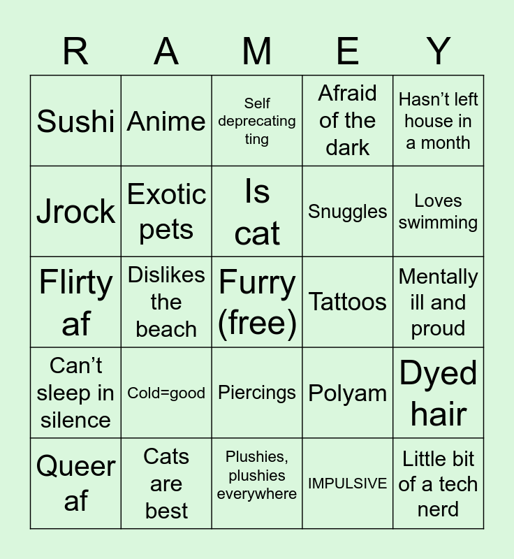 This bingo card has a free space and 24 words: Cold=good, Cats are best, Is cat, Queer af, Hasn’t left house in a month, Sushi, Jrock, Anime, Tattoos, Piercings, Snuggles, Flirty af, Polyam, Dyed hair, Exotic pets, IMPULSIVE, Mentally ill and proud, Self deprecating ting, Loves swimming, Dislikes the beach, Little bit of a tech nerd, Can’t sleep in silence, Afraid of the dark and Plushies, plushies everywhere.