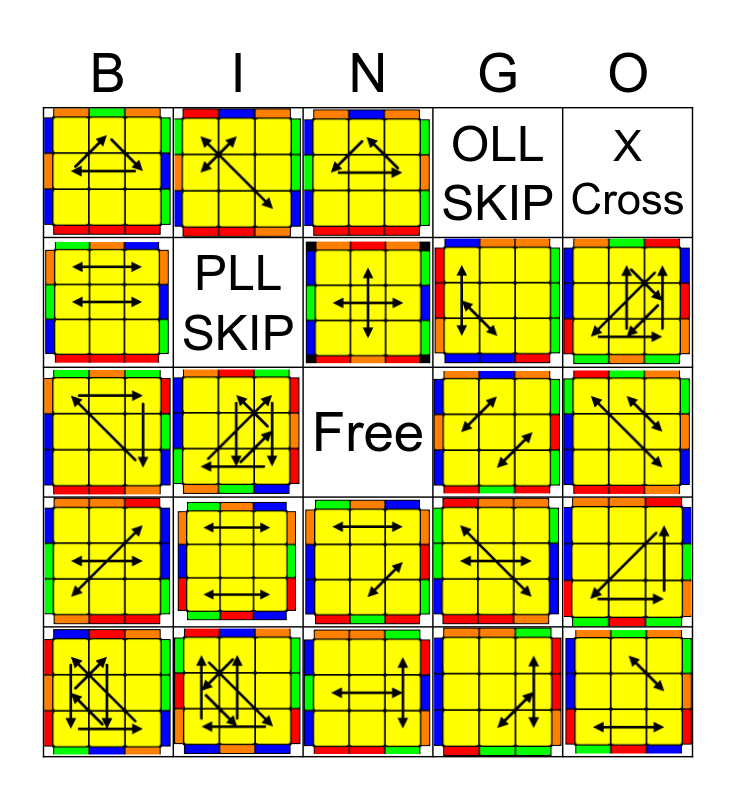 This bingo card has 21 images, a free space and 3 words: X Cross, PLL SKIP and OLL SKIP.