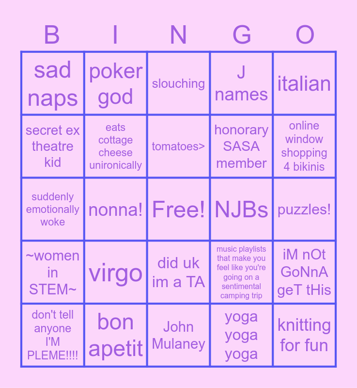 This bingo card has a free space and 24 words: don't tell anyone I'M PLEME!!!!, virgo, tomatoes>, yoga yoga yoga, italian, sad naps, poker god, slouching, NJBs, puzzles!, suddenly emotionally woke, eats cottage cheese unironically, music playlists that make you feel like you're going on a sentimental camping trip, iM nOt GoNnA geT tHis, secret ex theatre kid, bon apetit, John Mulaney, J names, online window shopping 4 bikinis, ~women in STEM~, nonna!, did uk im a TA, honorary SASA member and knitting for fun.