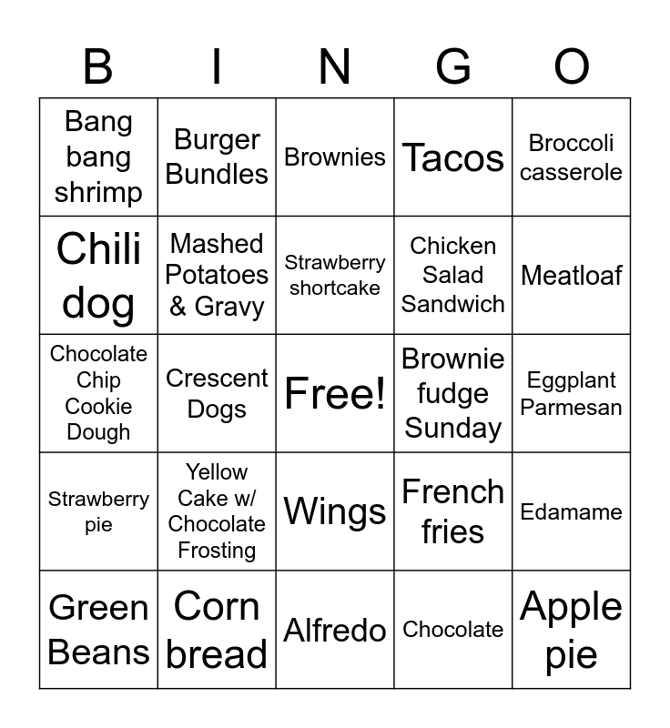 This bingo card has a free space and 60 words: Chicken fried steak, Corn bread, Watermelon, Strawberry pie, Chocolate, Turkey & Gravy, Mashed Potatoes & Gravy, Stuffing, Chicken Salad Sandwich, Chicken Parmesan, Tacos, Gen Tao Chicken, Chili dog, Loaded baked potato, Nachos, Bang bang shrimp, Apple pie, Broccoli casserole, Cornbread casserole, Strawberry shortcake, Brownie fudge Sunday, Brownies, Green Beans, Edamame, Pasta, Fruit Snacks, Corn on the Cob, Pork chops w/mushrooms, Meatloaf, Pea soup, Beef stew, Cinnamon buns, Coconut cream pie, Chicken pot pie, Burger Bundles, American Chop Suey, Spaghetti-O’s, Crescent Dogs, Squash Casserole, Chocolate Chip Cookie Dough, Cheese & Onion Omelet, Yellow Cake w/ Chocolate Frosting, Eggplant Parmesan, Rice and beans, French fries, Casserole, Ice cream, Chili, Grilled cheese, Wings, Alfredo, Steak, Spinach, Mashed potatoes, Mac and cheese, Pizza, Spaghetti and meatballs, Biscuits and gravy, Fried chicken and French onion soup.