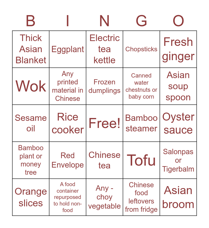 This bingo card has a free space and 24 words: Red Envelope, A food container repurposed to hold non-food, Frozen dumplings, Orange slices, Fresh ginger, Thick Asian Blanket, Wok, Eggplant, Bamboo steamer, Chinese tea, Canned water chestnuts or baby corn, Sesame oil, Tofu, Salonpas or Tigerbalm, Any printed material in Chinese, Chinese food leftovers from fridge, Oyster sauce, Electric tea kettle, Asian soup spoon, Rice cooker, Asian broom, Bamboo plant or money tree, Chopsticks and Any -choy vegetable.